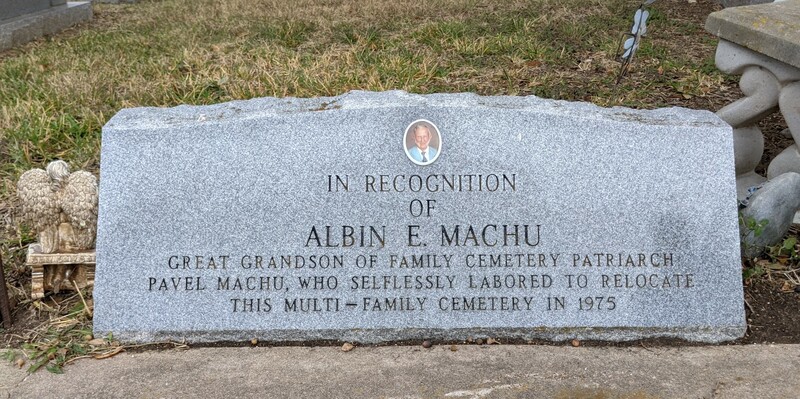 At the time of its relocation in 1975 Albin E. Machu envisioned a new home here that would be a "beautiful and a real peaceful place for generations to come. One the whole family can take pride in..." The newly organized Machu Cemetery Association Board of Directors erected this monument beside the front gate a decade later to recognize his tireless contribution toward making that vision a reality.