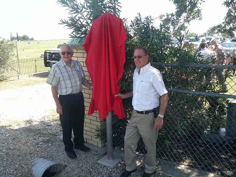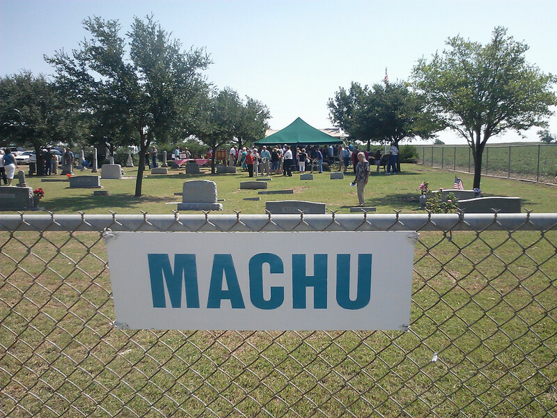 The research and application process for the cemetery's historical designation was prepared and submitted by Machu Cemetery Association board members Darwin and Nancy (Bryan) Machu. Active in the Texas Czech Genealogical Society, the pair have contributed much to the preservation of not only the Machu family's history but Czech culture statewide. Darwin, son of Anton & Millie (Kveton) Machu is shown (left) standing beside the Association's President Albin F. Machu (right) son of Albin E. & Vlasta Machu as the two prepare to unveil the Texas Historic Cemetery marker in 2013.