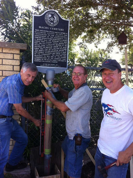 Albin E. Machu's sons Eugene and Albin F. and grandson Terry Loessin are shown here installing the Texas Historic Cemetery marker prior to the dedication ceremony in 2013.